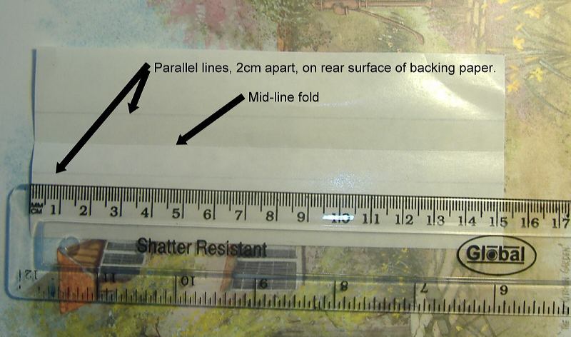The paper backing strip is folded in half along its longer dimension. This provides a centre line. Two guide lines are ruled parallel to the central line and (in my case) 1cm (0.5in) from it - one on each side of the central line. If you rule these lines on the back of the paper then there is no opportunity for the ink/pencil to get on your penis.