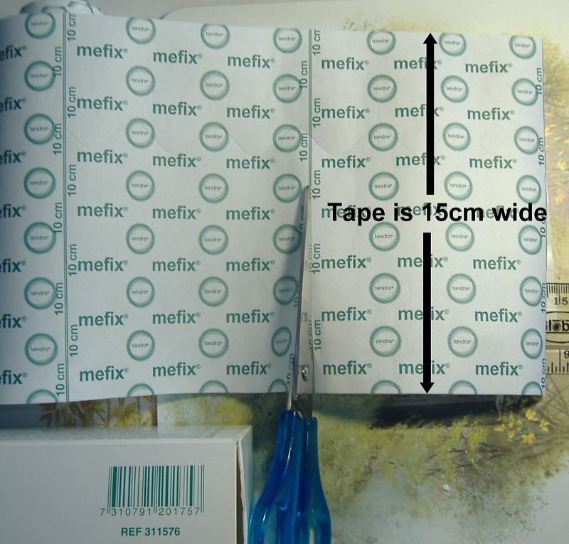 One big advantage (for me!) of Mefix is that it is available in rolls of width 15cm (6in). This is 2cm greater than the circumference of my erect penis. There are cutting guide lines every 10cm along the roll. 10cm will allow for 2 x 1cm for the top of the T and 4cm for the upright of the T. You now have a rectangle of Mefix 10cm X 15cm. One roll of Mefix is enough to make 50 of these T-tapes.